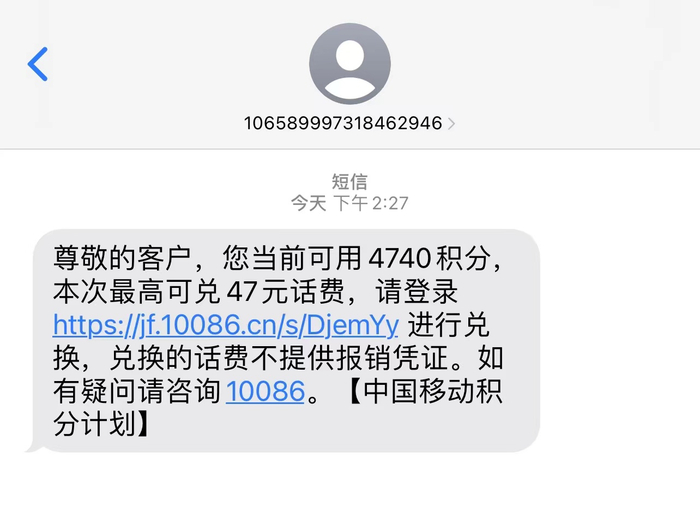打开手机短信,电信用户可编辑“JFDH”发送至10001查询或兑换积分。