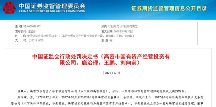 今年8月份,中国证监会公布行政处罚决定书,对高密国投责令改正、给予警告并处以60万元罚款;对相关责任人给予警告,并分别处以30万元罚款。