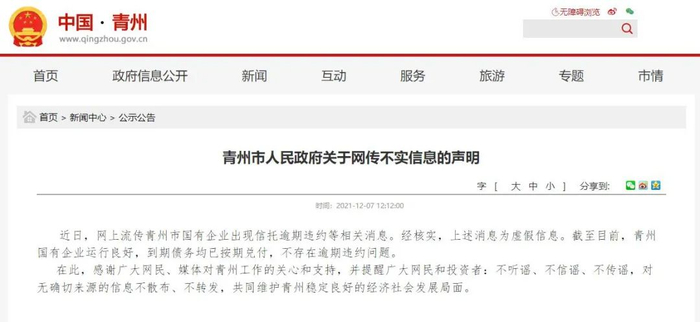 7日中午,青州市政府官宣“不存在逾期违约”。