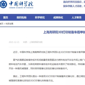 据中科院官网,中国科学院上海高等研究院工程科学团队在3D打印技术制备车载甲醇重整制氢催化剂研究中取得进展。