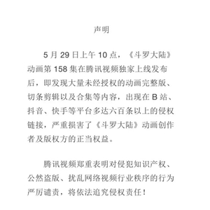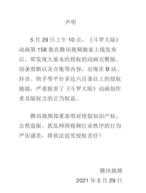 2021年5月30日,腾讯视频官方公众号曾发布声明称,《斗罗大陆》动画第158集在腾讯视频独家上线发布后,即发现大量未经授权的动画完整版、切条剪辑以及合集等内容,出现在B站、抖音、快手等平台。侵权链接多达六百条以上,严重损害了《斗罗大陆》动画创作者及版权方的正当利益。