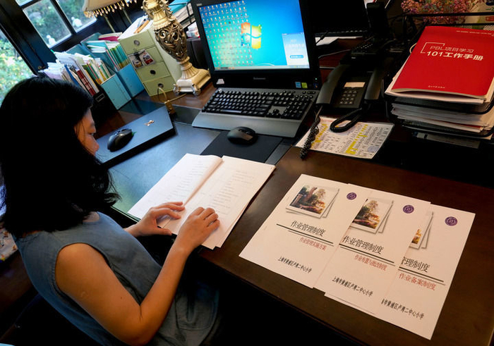上海市一名教师正在阅读根据“双减”政策及相关规定重新修订的作业管理制度。(新华社照片)