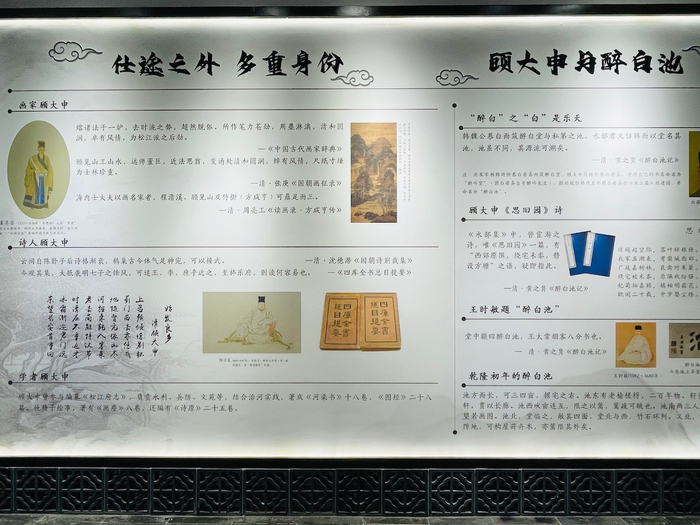 除了上述提及的顾氏生平,雅致的展厅里还以“仕途之外 多重身份”、“顾大申与醉白池”为主题,分别介绍历代名家和史籍对顾大申在诗、画及学术著作三个层面的刊载精选;还有以黄之隽所作《醉白池记》通篇的深入研析,解读醉白池与顾大申的历史渊源。