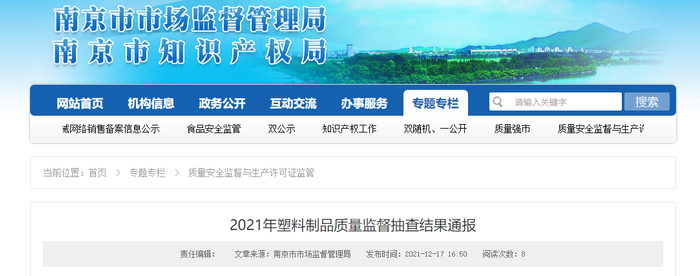 中国质量新闻网讯 2021年12月17日,南京市市场监督管理局网站发布《2021年塑料制品质量监督抽查结果通报》。据通报,2021年度南京市市场监督管理局组织抽查食品用塑料包装、容器、工具等制品产品85批次,全合格。