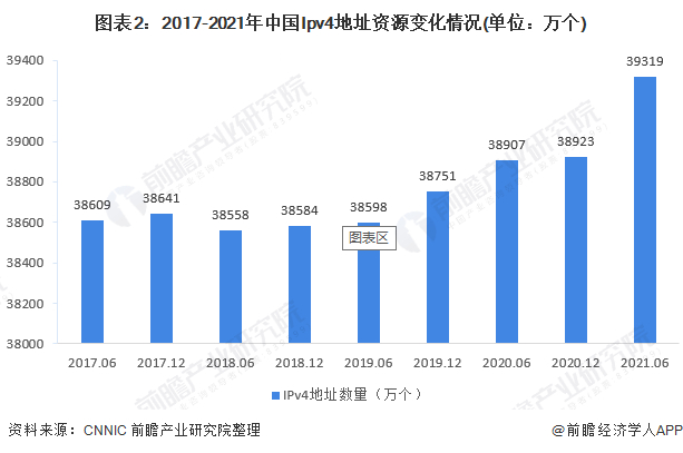 全球IPv4地址数已于2011年2月分配完毕,因而自2011年开始中国IPv4地址总数基本维持不变,截至2021年6月,我国IPv4地址数量为39319万个。