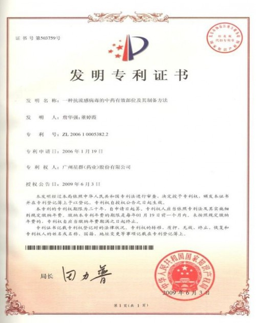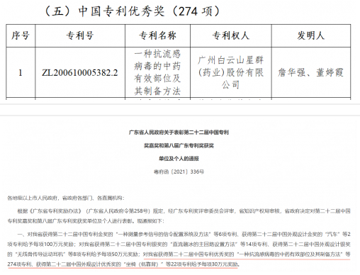近日,广东省人民政府表彰第二十二届中国专利奖嘉奖和第八届广东专利奖获奖单位,其中,来自广药集团的广州白云山星群(药业)股份有限公司“一种抗流感病毒的中药有效部位及其制备方法”(专利号:ZL20061 0005382.2)荣获第二十二届中国专利优秀奖。