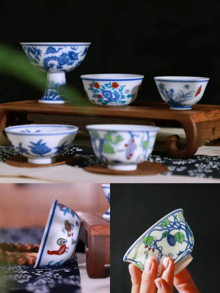 以上5款斗彩鸡缸杯、斗彩三秋杯等聚首,高度仿古复烧,还原斗彩之美。均由故宫文物修复专家——阳士琦大师监制,1:1等比例原貌打造。