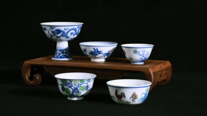 除了明成化斗彩三秋杯,明成化斗彩鸡缸杯、明成化斗彩葡萄纹杯、明成化青花秋葵杯、明宣德龙纹高足杯……个个都是国宝。