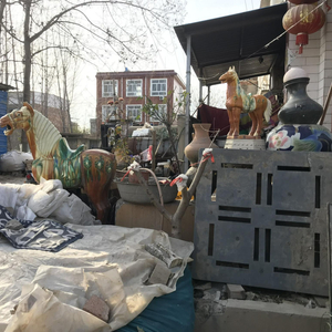 洛阳白马寺董村位于洛阳市区西北邙山南麓,古墓众多,流传着“无卧牛之地”的说法。至今还有多家农户制作唐三彩工艺品,屋舍前堆放着废弃的陶俑制品,手写的指示牌提醒有农户销售唐三彩。农户称,他们卖的其实都是现代工艺品,二三百元一个小件,供古玩爱好者赏玩。