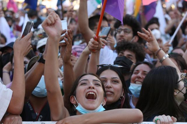 在智利首都圣地亚哥,博里奇的支持者听到胜选的喜讯后,在广场上欢呼、拥抱,挥舞着绘有博里奇肖像的旗帜。