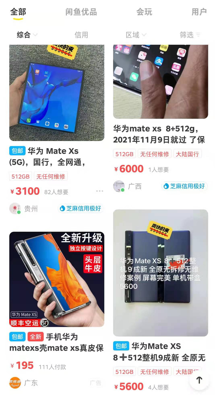 在二手交易平台闲鱼上,曾有不少人以近10万元高价求购华为折叠屏手机Mate Xs,这款手机的官方最低售价为16999元,如今消费者以3000-6700元就能买到。