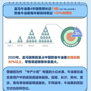 “4年间,牛油果的销售增长了近15倍!”盒马水果采购总监欧宏星说,2020年,在进口即食牛油果的销量大盘中,盒马的牛油果销售量约占市场的30%,在国内的零售商渠道中占比第一。随着国产牛油果的产量和品质的提升,中国人自己种的即食牛油果,有望占到盒马牛油果销量的50%。