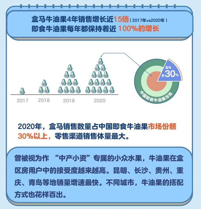 从2018年开始,盒马在全国全面推开即食牛油果,不卖青果,上架的都是熟度刚刚好的牛油果。结合线上线下的营销推广、社群美食分享等,让用户认识、了解牛油果,并会各种“花式搭配”,盒马平台上,牛油果的销量高速增长。