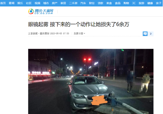 一位女司机眼镜起雾看不清路况发生追尾,