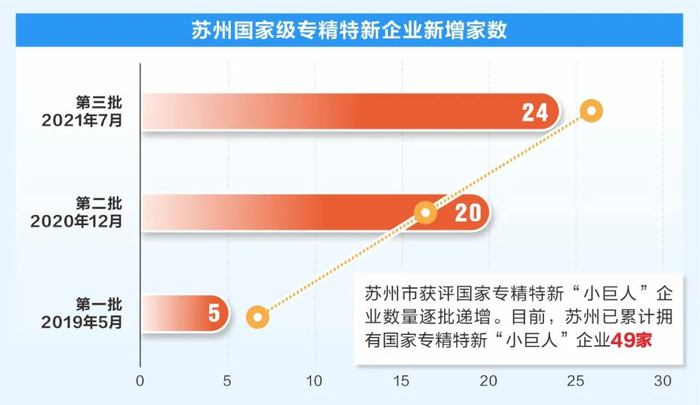 苏州市工信局数据显示,目前,苏州已累计拥有国家专精特新“小巨人”企业49家,江苏省专精特新“小巨人”企业247家,均位列江苏全省第一。
