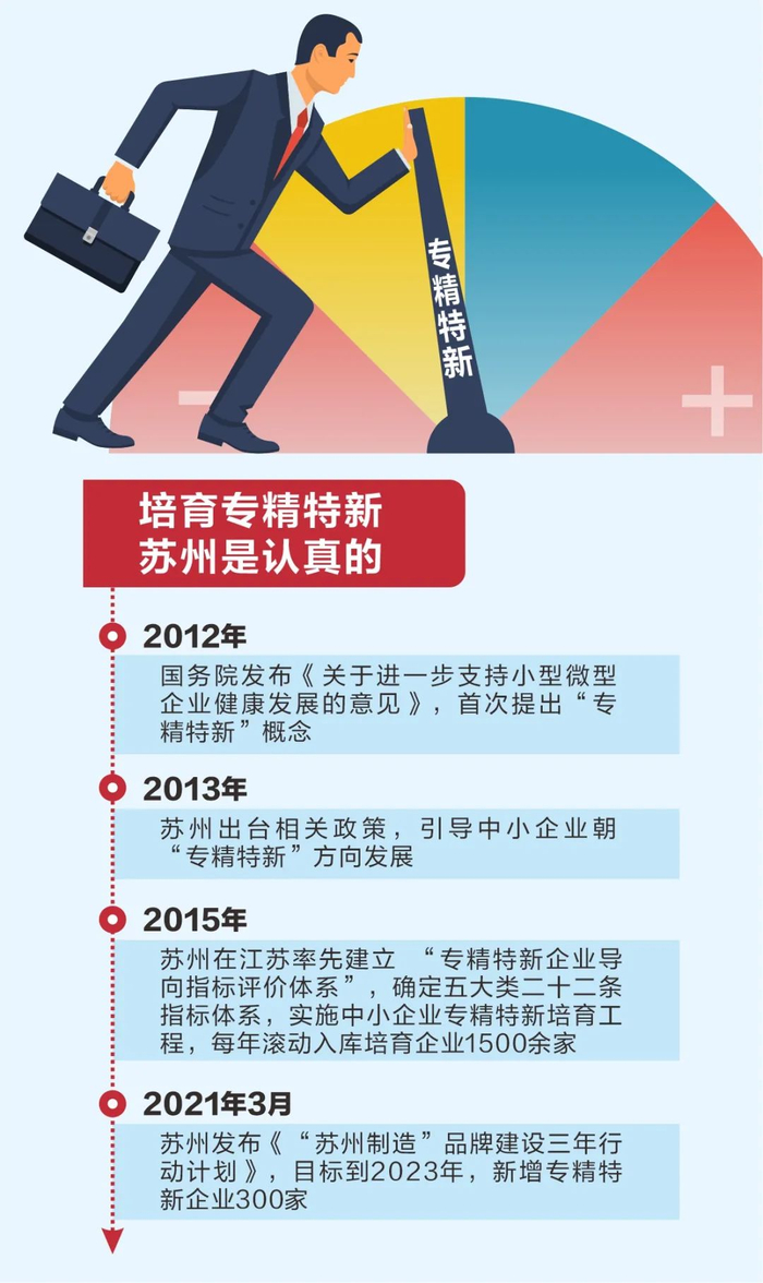 据悉,未来苏州将加快培育发展专精特新中小企业相关措施,深入做好专精特新“小巨人”企业等培育工作。根据今年3月苏州发布的《“苏州制造”品牌建设三年行动计划》,苏州将培育一批“苏州制造”知名企业,到2023年,新增专精特新企业300家。