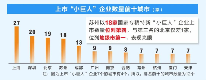 今年11月,国家工业信息安全发展研究中心数据资源所中小企业室发布的《专精特新“小巨人”上市企业发展研究》显示,上市“小巨人”企业数量Top10城市排名中,苏州以18家国家专精特新“小巨人”企业上市的数量位列第四,与第三名的北京仅差1家。