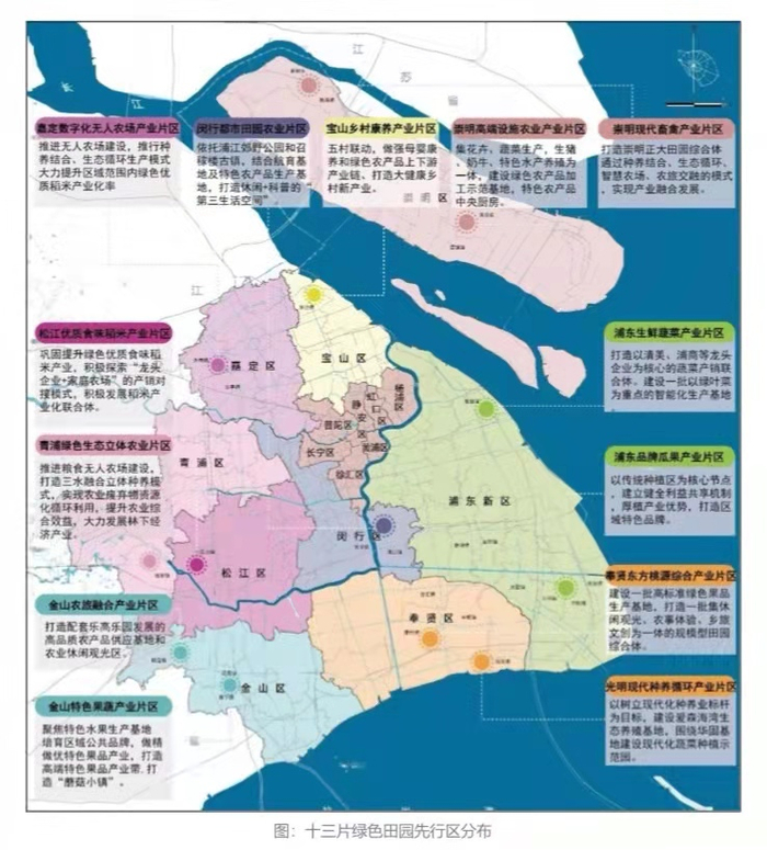 此外,浦东新区将重点打造生鲜蔬菜产业片区、品牌瓜果产业片区;崇明区建设现代畜禽养殖产业片区和高端设施农业产业片区;嘉定区探索数字化无人农场产业片区;奉贤区重点建设东方桃源综合产业片区;青浦区打造绿色生态立体农业片区;闵行区建设都市田园农业片区;光明集团打造现代种养循环产业片区。