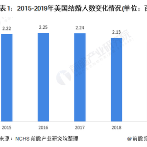2015-2019年美国结婚人数呈波动下降趋势。根据美国国家卫生服务中心统计的数据,2019年美国约有202万对新人结婚,同比下降5.16%;其主要原因是理由是经济受到重创,旅行和社交活动都受到限制。联邦机构的研究表明,经济是影响结婚的一个重要因素,而新冠疫情的持续性影响,将削弱美国人们组建家庭的想法。