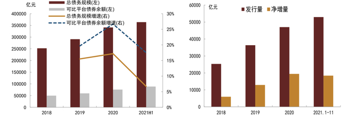 图表1:城投平台总债务规模和增速(左);城投债年度发行和净增量(右)
