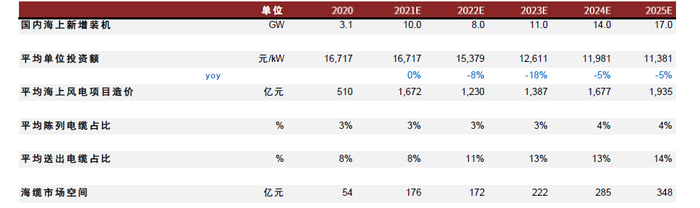 十四五期间,风电海缆市场规模有望翻倍。基准情况下,我们预计2021-2025年国内海上新增装机为10.0/8.0/11.0/14.0/17.0GW,海缆对应市场空间从2021年抢装时期的176亿元有望提升至2025年的约348亿元,十四五期间实现翻倍。此外,一般海缆的使用寿命在20年左右,未来可能有更换需求,而海缆敷设、维修服务市场前景也很可观,实际风电海缆行业规模有可能超过上述数值。