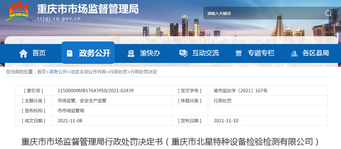 违反特种设备安全法!重庆市北星特种设备检验检测有限公司被罚18万,主管负责人被罚4.2万