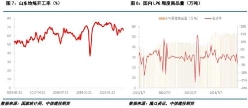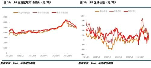 从季节性特征来看,2021年LPG的季节性特征弱化,在传统淡季需求并未出现明显下降,6-8月表观需求量为年内较高水平。LPG季节性特征弱化的原因,我们认为主要是受到需求结构变化的影响。2021年LPG化工深加工需求出现快速增长,占总需求的比重持续提升,初步估计2021年深加工需求的比重超过50%,且明显高于燃料需求占比。LPG历史上的淡旺季特征十分显著,主要原因是燃料需求的季节性特征较为明显,夏季燃料需求下降,冬季燃料需求上升,带来价格的波动剧烈。而2021年LPG化工深加工需求占比提升,燃料需求占比下降,燃料需求的季节性波动对LPG总需求的影响变小。叠加2021年1-9月份国际原油价格表现强势,10-12月弱势下跌, LPG价格在传统淡季6-8月并未下跌,反而在传统旺季10-12月出现较大的跌幅。随着化工深加工需求的持续提升,LPG价格的季节性特征将继续弱化,尤其是传统淡季需求表现可能并不差,淡季价格跌幅可能较小。
