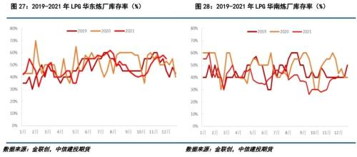 2021年国内LPG库存率窄幅波动,维持在30-70%区间,库存率变动较为平稳,整体表现出夏季累库冬季去库的特征。其中炼厂库存率整体低于2020年同期水平,港口库存率高于2020年同期水平。
