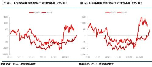 从期现基差看,2021年LPG期现基差整体呈现出先弱后强的趋势,1-10月基差走弱,11-12月基差走强。具体来看,2021年LPG全国现货均价与期货主力合约的基差均值为-57元/吨,最大值为918元/吨,出现在12月初,最小值为-1140元/吨,出现在9月末。基准市场华南地区现货价格与期货主力合约的基差均值为130元/吨,最大值为1456元/吨,出现在11月中旬,最小值为-992元/吨,出现在9月末。2021年LPG基差大幅波动,基差变动趋势和2020年同期较为接近,但2021年基差绝对值大于2020年同期水平。2021年LPG基差在淡季走弱,旺季走强,表明现货价格走势具有明显的滞后性,期货价格先于现货价格见底,也先于现货价格见顶,较好地发挥了期货价格发现的功能。预计2022年LPG基差波动趋势整体将延续2021年的趋势,即传统需求淡季期货价格可能强于现货价格,传统需求旺季期货价格弱于现货价格。
