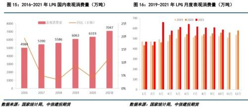2021年国内经济复苏进程加快,全年经济增速有望达到8.0%,社会消费品消零售总额和餐饮业零售总额都出现正的增长,带动LPG需求增加。国家统计局数据显示,2021年1-10月我国LPG的表观消费量为5839.58万吨,同比增长12.74%。取近三月均值估计11-12月表观消费量,2021年我国LPG的表观消费量估计值为7047.43万吨,同比增速有望达到11.86%,高于我们年初对LPG需求增速的预测。考虑到齐翔腾达等PDH装置有望在2022年投产,预计2022年LPG需求将维持较高增速。