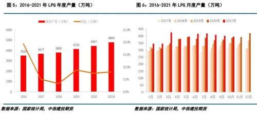 分月份来看,2021年7月产量最大,单月产量达到418.40万吨;3月产量增幅最大,同比增幅22.84%。4月产量增幅最小,仅0.40%。考虑到国内原油需求增速放缓,预计2022年国内LPG产量增速将小于2021年。