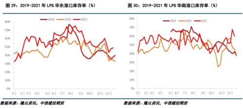 从港口库存率看,受到需求增长的影响,2021年国内LPG进口量大幅增长,港口库存率上升明显,整体高于2020年同期水平,但仍具有较强的季节性特征,库存率高点出现在七月份,低点出现在九月份。截止到2021年12月中旬,华东港口库存率为49%,华南港口库存率为60%,都明显高于2020年同期水平。预计2022年港口库存率和2021年相比变动不大,库存率整体维持在40-70%区间。
