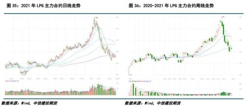 2021年LPG主力合约整体呈现先扬后抑的走势,1-4月末价格震荡为主,价格在3300-4000区间震荡;4月末-10月初强势上涨,涨幅近100%;10月中旬-12月初价格持续下跌,跌幅近40%。目前LPG下跌仍未结束,盘面5000附近是近期反弹高点,为第一压力位,5200附近是60日均线,为第二压力位;下方12月初的低点4000-4100是第一支撑位,4月份低点3600-3650是第二支撑位。从成交量来看,2021年1-8月成交量较低,多数时间日成交量低于10万手,9月下旬-12月中旬成交量明显放大,主力合约日均成交量约20万手,主要是受到价格波动增大、资金参与热情提高影响。综合来看,当前LPG期货合约弱势运行,仍处于下跌通道,短期4000附近有较强支撑,但中期在现货价格下跌的利空影响下,LPG价格重心仍将下移,届时需密切关注3600附近支撑。建议投资者等待反弹至强压力位后可轻仓试空,并严格设置止损。