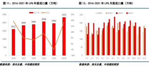 进口量方面,预计2022年国内LPG进口量将维持较高增速,进口结构仍以进口丙烷为主。2022年国内多套PDH装置有望投产,将带动丙烷需求的明显增加,推动LPG进口量的大幅增长,初步预计2022年LPG进口量的增速将超过10%。