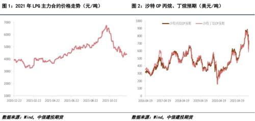 2021年LPG期现价格大幅波动,期货价格振幅超过100%。从价格走势来看,2021年期货价格呈现出明显的先扬后抑的走势,走势大致分为三个阶段:1月价格大幅下跌,2-9月强势运行,10-12月价格快速下跌。1月份LPG期货主力合约价格下跌12.16%,该阶段LPG需求旺季结束、需求下降,且受到春节放假影响,LPG炼厂主动降价排库,价格大幅下跌。2月至10月初,LPG期货价格强势上涨,主力合约价格从低点3253元/吨上涨至高点6836元/吨,最大涨幅110.14%。该阶段LPG需求增加、成本大幅上升,对价格上涨起到助推作用;期间WTI原油价格从52美元/桶上涨至82美元/桶,涨幅近58%,沙特丙烷CP从550美元/吨上涨至800美元/吨,丁烷CP从530美元/吨上涨至795美元/吨。10月中旬至12月初,LPG期货价格大幅下跌,主力合约价格从高点6836元/吨下跌至低点4103元/吨,最大跌幅39.98%。该阶段LPG需求旺季表现不及预期,拖累价格走势,期间WTI原油价格最大跌幅近24%,LPG成本支撑下移,对价格形成明显利空。