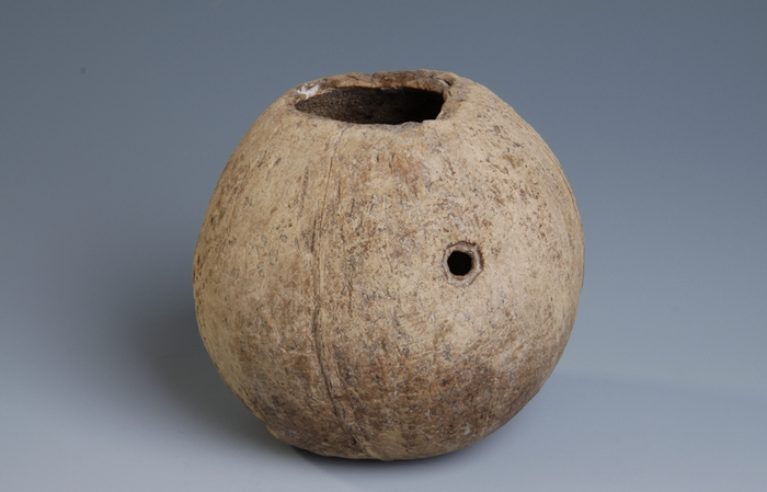 1974年泉州发现的宋代沉船“泉州一号”上发现的南宋椰子壳:近似球形,椰子壳经过加工壳顶挖一小孔个,孔径4.8厘米,腰部也挖有一小孔,径约0.8厘米。图片来自泉州海外交通史博物馆官网。