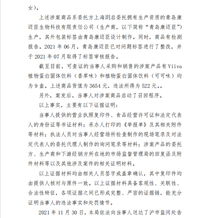 上述涉案商品系委托方上海玥启委托拥有生产资质的青岛康迈臣生物科技有限责任公司(生产商,以下简称“青岛康迈臣”)生产,其外包装标签由青岛康迈臣设计制作。同时,商品有检测报告。2021年6月,青岛康迈臣对问题标签进行了整改,并于2021年7月取得了标签审核报告。截至目前,可查证的安永保健品上海分公司采购和销售的涉案产品有Viiva植物蛋白固体饮料(香草味)和植物蛋白固体饮料(可可味)均为9盒。上述商品货值为3654元,违法所得为522元。