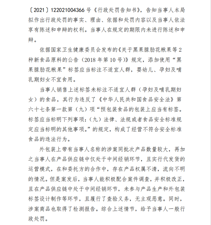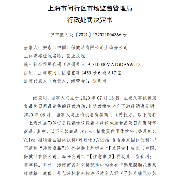 行政处罚决定书显示,安永保健品上海分公司成立于2020年7月16日,主要从事预包装食品和日用品销售的经营活动,其运营模式为向下游经销商分销。2020年8月,安永保健品上海分公司与上海玥启贸易商行(委托方,以下简称 “上海玥启”)签订总经销协议经销多款预包装食品及日用百货等商品。其中,以下三款商品(Viiva 植物蛋白固体饮料(香草味)、Viiva 植物蛋白固体饮料(可可味)、Viiva 复合水果固体饮料(以下简称“涉案商品”))外包装上均标有“【总经销】安永(中国)保健品有限公司上海分公司”、“【注意事项】婴幼儿不宜食用;”等字样。另外,涉案商品外包装配料中均含有“黑果腺肋花楸果纤维粉”成份,外包装标签未标注不适宜人群(孕妇及哺乳期妇女)。