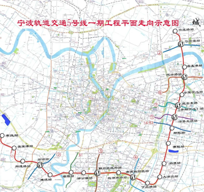 5号线,西起海曙布政站,止于镇海兴庄路站,全长27.9公里,设车站22座(含10个换乘站),均为地下站。