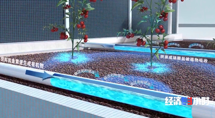 通俗地说,就是养鱼池排出的含有鱼粪便的污水,鱼粪便经过分解后,里面的营养成分被蔬菜吸收,然后剩下的污水经过鹅卵石过滤净化变干净后,再回收到鱼池继续养鱼。这种既养鱼又种菜的模式、方法,叫鱼菜共生。简单归纳一句话就是,养鱼不换水,种菜不施肥。