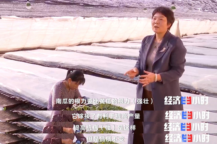 在寿光,现在种植户们种植黄瓜已经不是自己购买种子育苗种植,而是由专业化公司进行育苗。黄瓜苗育好之后,种植户会直接订购种苗栽植到大棚里。在育苗现场,记者看到,一名员工正忙着把黄瓜苗,嫁接到南瓜苗上。