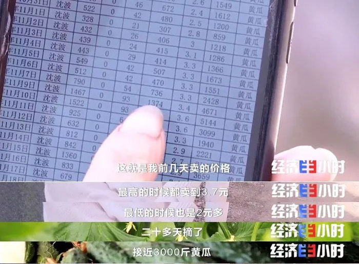 刚刚采摘下来的这些黄瓜,马上就会卖给附近的经销商,每天卖掉黄瓜后,刘玲霞都会在手机上详细做好记录。