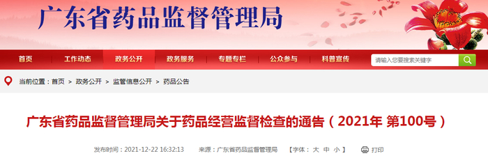 中国质量新闻网讯 2021年12月22日,广东省药品监督管理局网站发布关于药品经营监督检查的通告(2021年 第100号)。据通告,根据《药品经营质量管理规范》《药品检查管理办法(试行)》等有关规定,该局组织对广东悦康药业有限公司等34家药品经营企业进行了药品经营质量管理规范(GSP)符合性监督检查,并将综合评定结论为符合和基本符合的予以公布。