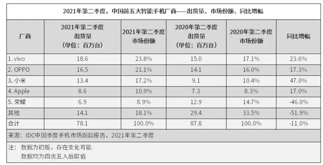 根据2021年7月IDC公布的2021年Q2中国市场手机出货量数据显示,VIVO排名第一,在第二季度手机出货量1860万台,同比增长23.6%,增速较快,超过OPPO,占据市场23.8%;OPPO排名第二,第二季度手机出货量1650万台,同比增长17.1%,占据市场份额21.1%;小米排名第三,第二季度手机出货量1340万台,相较于上年同一句季度910万台,同比增长47%,增速最大。