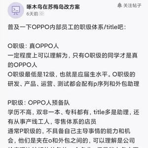 OPPO内部员工分为O和P两个职级,以及外包序列。O职级,正经OPPO人,最低是12级,P职级员工一般学历不高,双非一本、专科都有,多任职助理,还有一些生产线工人和零售体系的店员;外包序列就是外包公司签的员工。O职级在进行研发、产品、运营、测试等工作时都会配有P职级员工和外包模块的主助理。