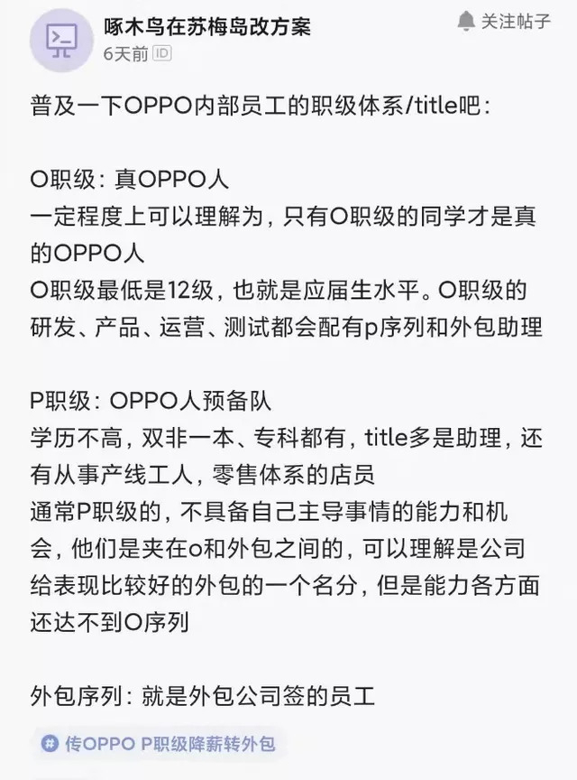 近日,脉脉App上OPPO内部员工传出OPPO强制P职级员工转外包,有的岗位甚至100%转外包。
