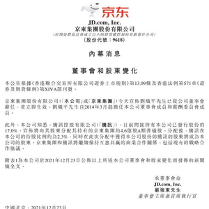 腾讯公告称,待由该公司分派之京东集团股份实际总数,将在合适及必要的情况下进行有关调整,以使实物分派将按记录日期持有每21股股份获发1股京东集团A类普通股的基准。