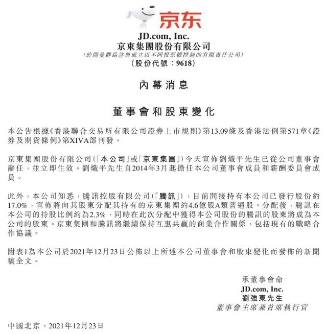 12月23日早上港股开盘前,腾讯控股(00700.HK)公告称,计划将所持有的4.57亿股京东集团-SW(09618.HK)股份作为中期股息派发给股东。派发完成后,腾讯持有京东股份占比将从17%降至2.3%,腾讯控股总裁刘炽平也将卸任京东董事,京东集团也发布了相关公告。