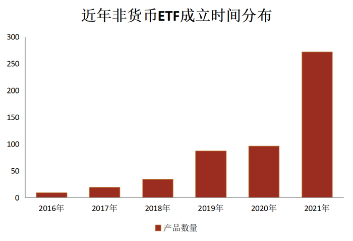 从发行人来看,华夏基金、国泰基金和易方达基金今年发行非货币ETF产品数量均超20家。非货币ETF市场规模的爆发离不开其自身独特的产品优势和投资者对丰富资产配置的需求。