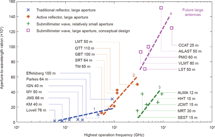 图1 根据口径和最高工作频率划分的四类全向可动反射面天线。IGN:西班牙国家地理研究所;MY:密云;JMS:佳木斯;KM:昆明;LMT:墨西哥大型毫米波望远镜;QTT:奇台射电望远镜;SRT:撒丁岛射电望远镜;TM:天马;HHT:赫兹望远镜;JCMT:麦克斯韦望远镜;MRT:西班牙毫米波射电望远镜;SEST:瑞典ESO(欧洲南方天文台)亚毫米波望远镜;CCAT:康奈尔-加州理工阿塔卡马望远镜;AtLAST:阿塔卡马大口径亚毫米波望远镜;PMO:紫金山天文台;VLMT:甚大毫米波望远镜;LST:大型亚毫米波望远镜